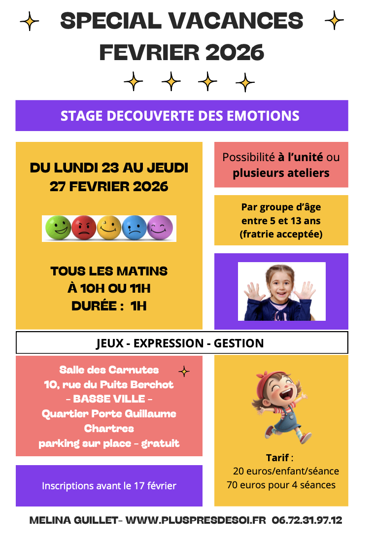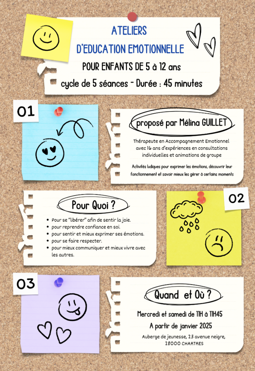 De novembre 2021 à mai 2022, j'ai réalisé des ateliers d'éducation émotionnelle toutes les semaines auprès d'enfants en difficulté scolaire à la Réussite Educative de la Ville de Dreux. Forte de cette expérience et des résultats très positifs pour les enfants, j'ai décidé de proposer ces ateliers sur Chartres.